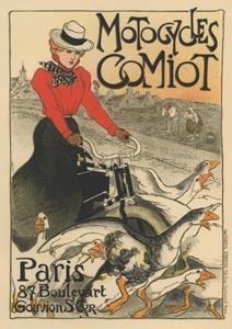 Steinlen poster reading "Comiot motorcycles, Paris, 87 boulevard Gouvion, St-Cyr." 1899. - Theophile-Alexandre Steinlen (Swiss, naturalized French; 1859-1923): In Paris from 1882; great chronicler of Montmartre life; etcher, painter, lithographer; contributed to many magazine; did book illustrations; decorated cafe walls.